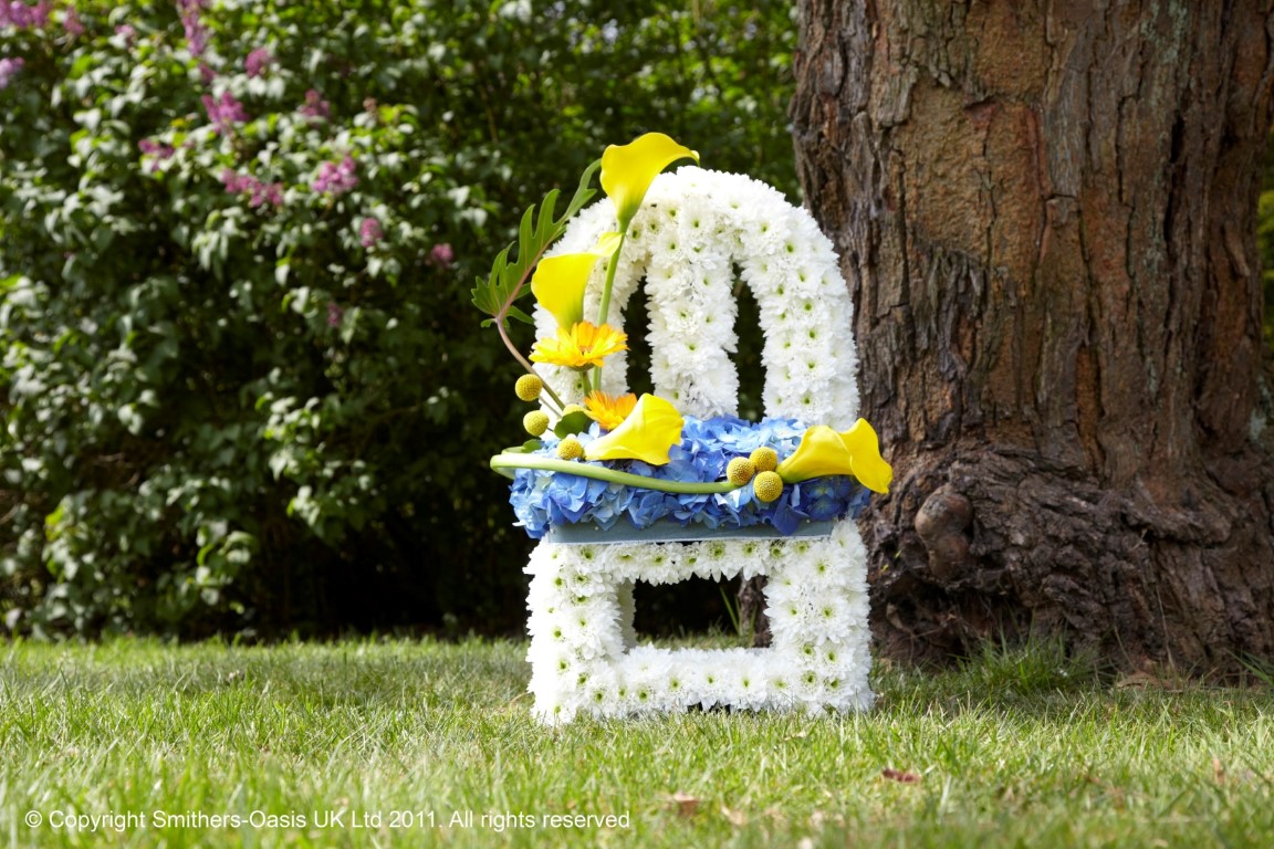 A seat of double white spray chrysanthemum decorated with a cushion of flowers and a spray of yellow flowers.