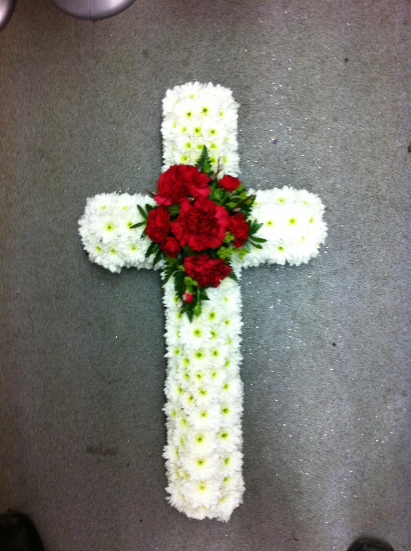 A beautiful classical based cross funeral tribute. The cluster of flowers and ribbon edge can be made in the colours of your choice.