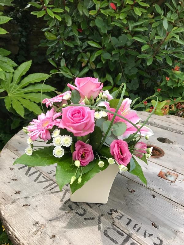 A stunning floral arrangement in shades of pink with a hint of cream. The design is easy to care for and is arranged in a cream ceramic pot. Please note the container may differ from that shown in the image.