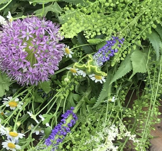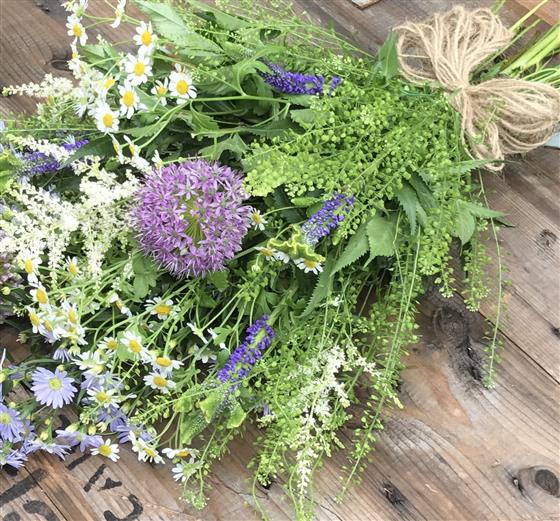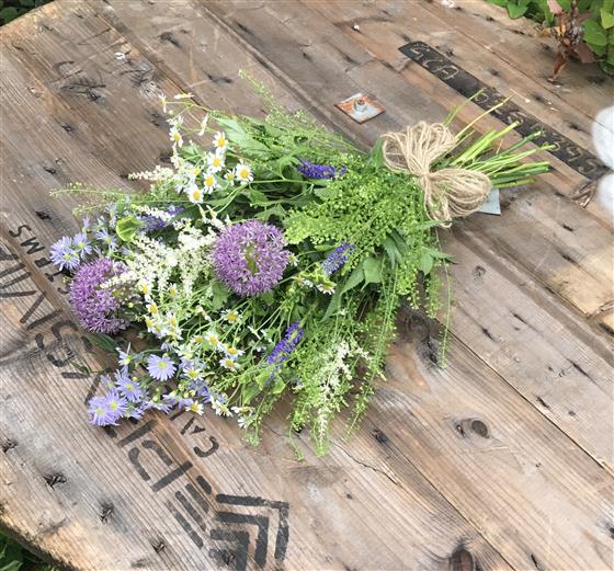 A seasonal arrangement of flowers expertly handtied in a traditional 'flat' style. Finished with a subtle ribbon. Please note this product is not wrapped in cellophane.