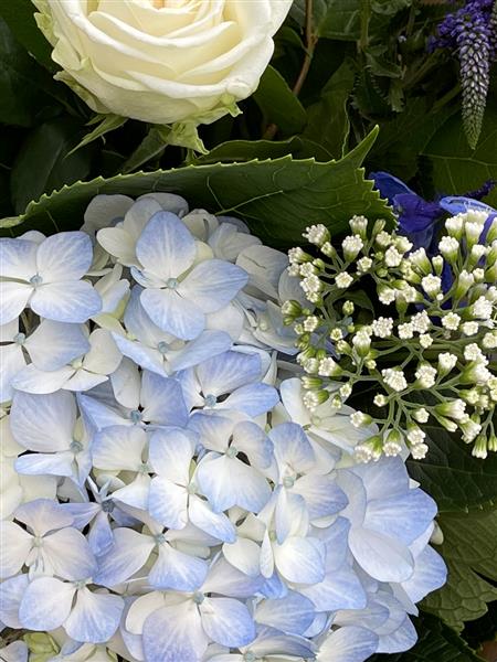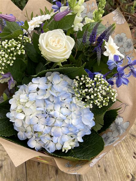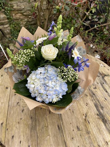 A beautiful bouquet featuring hydrangea, roses, snap dragons & other seasonal foliages in white, blue & purple. ** please note that hydrangea are not available all year round and may need to be substituted for alternative flowers when they are out of season **