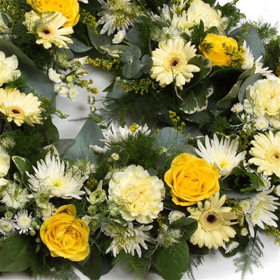 A selection of seasonal greenery forms the base of this mixed open heart tribute, with glorious seasonal flowers in yellow, lemon and cream.