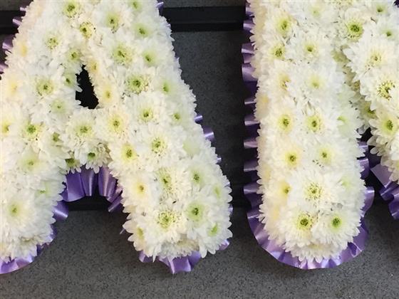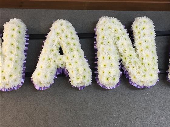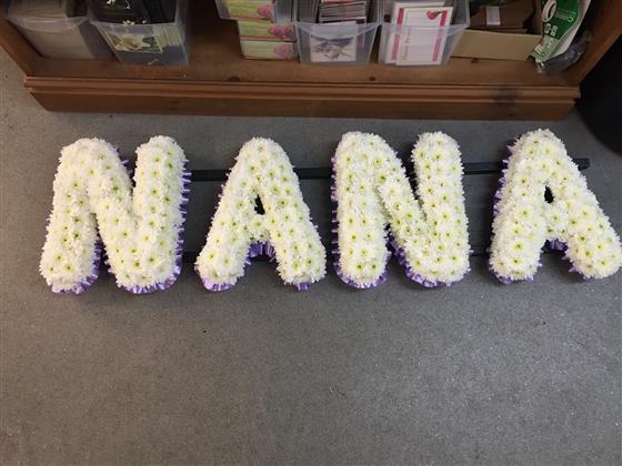 A lovely white chrysanthemum based NANA tribute (if you require NANNA or NAN please order using the individual letters option). Ribbon & Clusters in the colour of your choice.