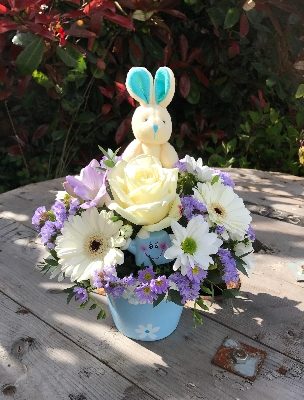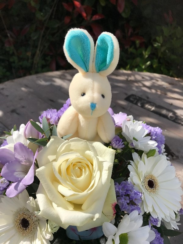 A simply divine arrangement to say 'welcome' to a new addition to the family. The arrangement will be created in a ceramic pot with seasonal flowers in blue and cream with a gorgeous small teddy bear detail.