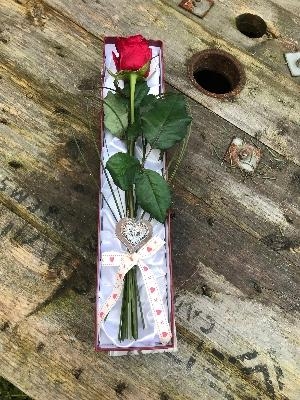 A gorgeous single red rose with lovely foliage presented in a lined gift box finished with red satin ribbon. A beautiful gift for the special person in your life. (please note that the heart may be substituted for an alternative decoration)