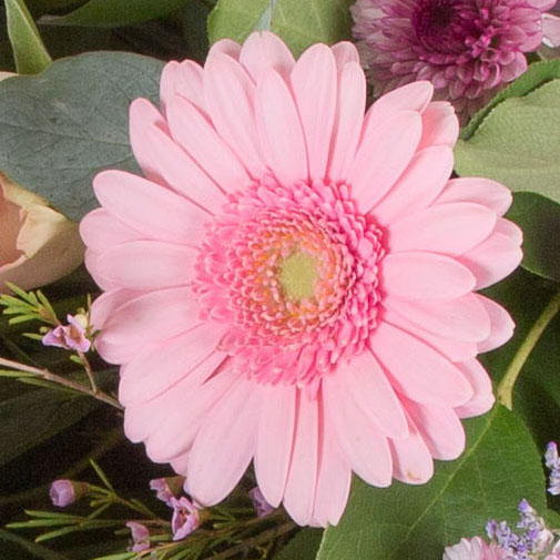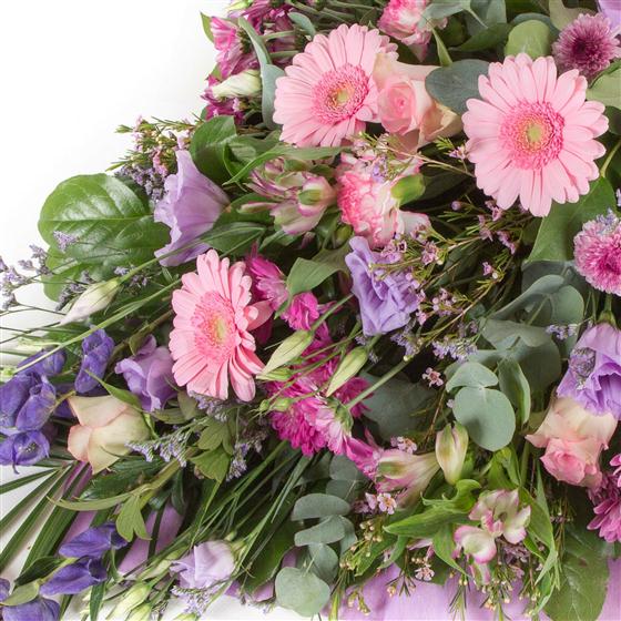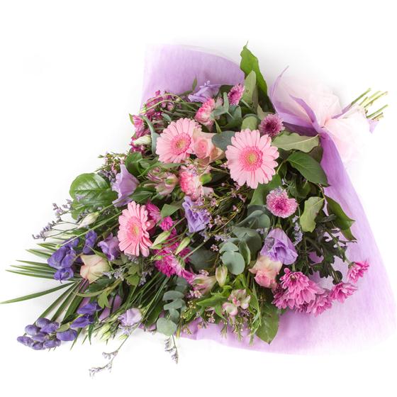 A pretty bouquet in lilacs and pinks including eustoma, chrysanthemum, carnations, gerberas, wax flower and complimentary foliage.