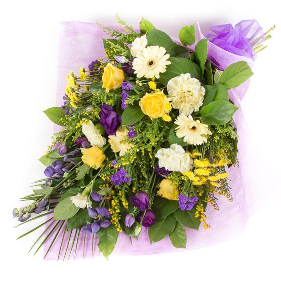 A traditional sheaf of golds and purples carefully chosen by our expert florists.