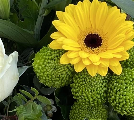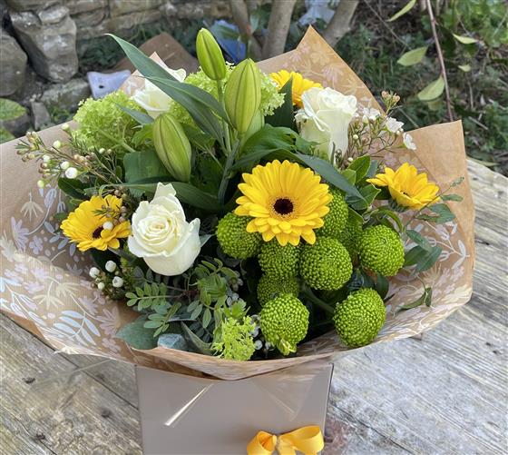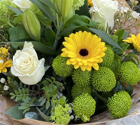 A crisp white and lime hand tied bouquet including roses, lilies and chrysanthemums highlighted with sunshine yellow mini gerberas and other seasonal green flowers and foliage.