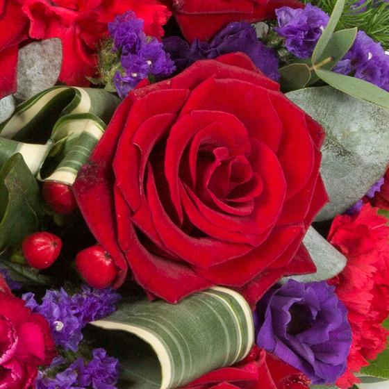 An all round posy arrangement of deep red roses, spray carnations and hypericum berries mixed with vibrant purple statice.