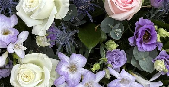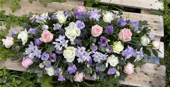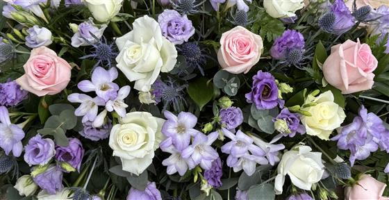A beautiful casket spray of roses, freesia, eustoma and eryngium (thistle) in soft pastel shades of cream, white, pink and lilac with complimentary foliage. This is a perfect combination of flowers for those wishing to exclude lilies from the tribute.