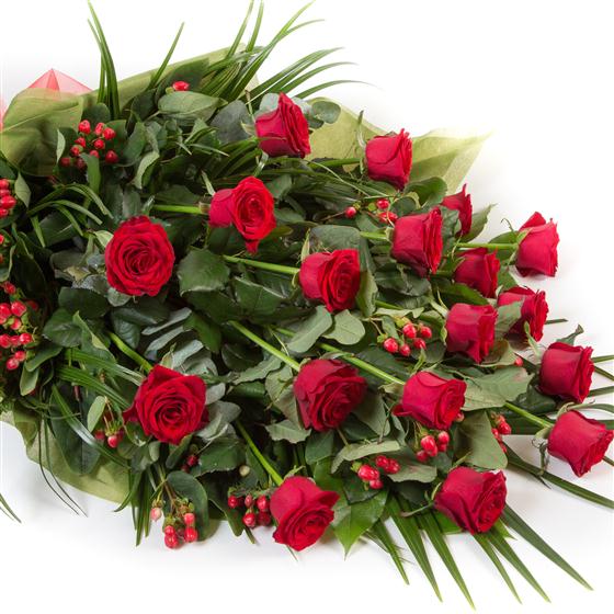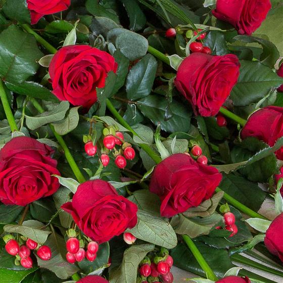 Long stemmed red roses, hypericum berries and mixed foliage combine to make an elegant, simple tribute.