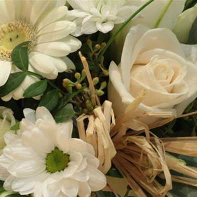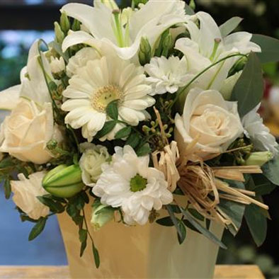 Classic whites and creams including scented lilies, roses, gerberas and chrysanthemums are used to create this dainty arrangement. The container used for this arrangement may differ from that shown in the image and flowers may be delivered in bud to ensure longevity.