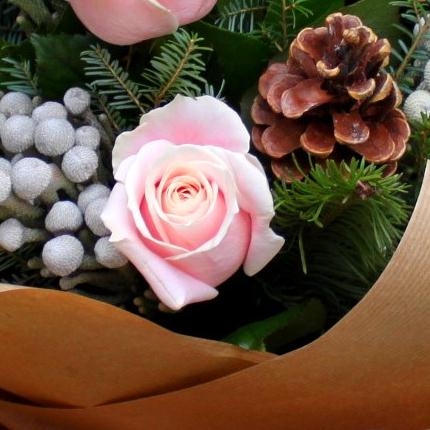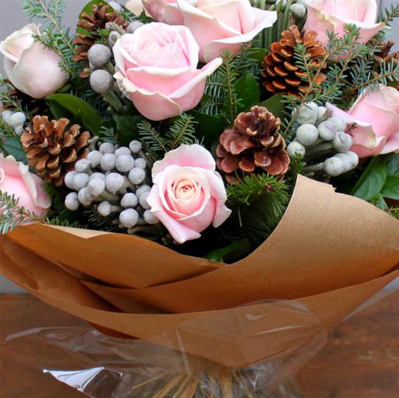 12 Vintage style pink roses, brunia, spruce and pine cones make up this winter hand tied.