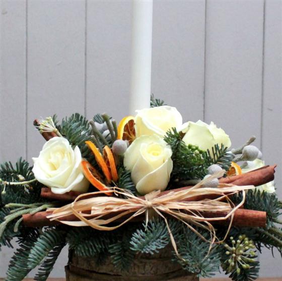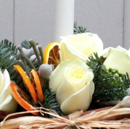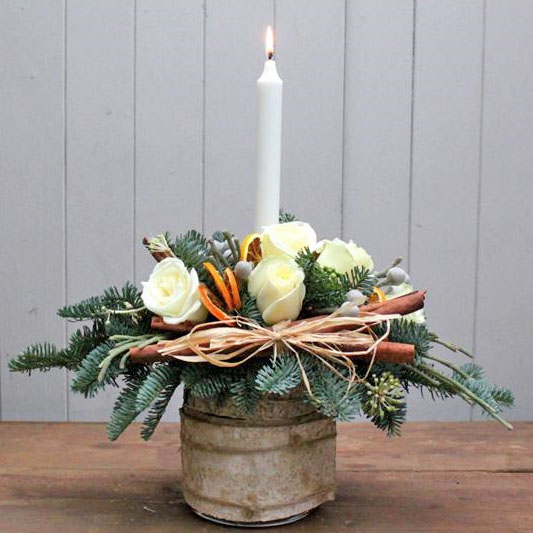 A lovely container filled with scented spruce, cinnamon, white roses and brunia which combine to make this beautiful Christmas table centre.