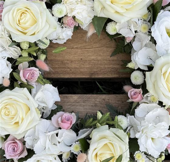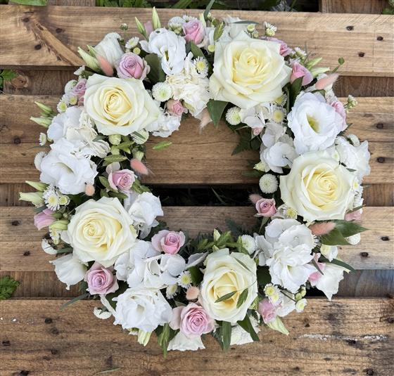 A stunning wreath of beautiful opulent white flowers with a delicate hint of pink running throughout the design.